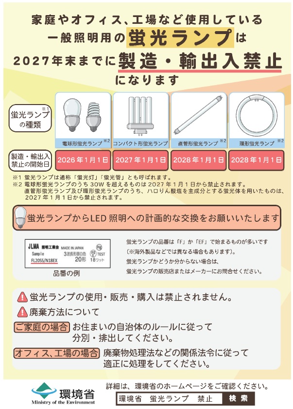 2023年10月30日から11月3日にかけてスイス・ジュネーブにおいて開催されました「水銀に関する水俣条約第5回締約国会議(COP5)」におきまして、水銀添加製品である一般照明用の蛍光ランプについて、その種類に応じて、2025年末から2027年末までに製造及び輸出入を段階的に廃止することが決定されました。