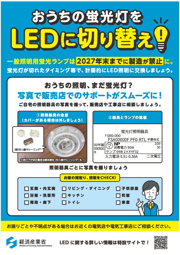 これからは蛍光管が手に入りにくくなり、蛍光管の高騰が考えられます。また、蛍光管の処分にもけっこうな処分費がかかっております。蛍光管の交換の際に、ぜひ省エネであるLED照明への切り替えをご一考ください。